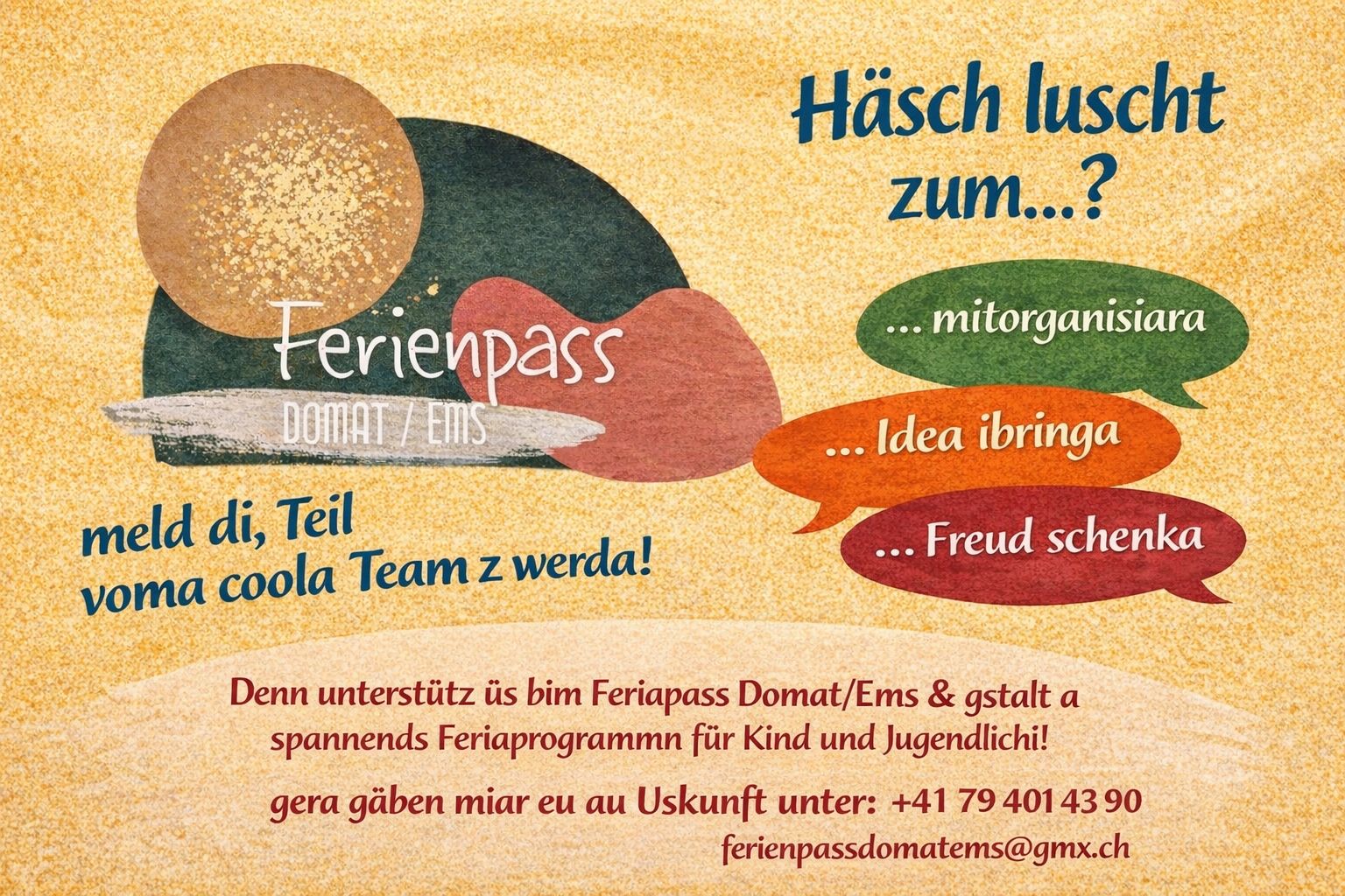 Startseite Aktuelles Häsch luscht zum...? Häsch luscht zum...? 14. April 2026 Kontakt Ferienpass Domat/Ems7013 Domat/Emsinfo@ferienpass-domat-ems.ch079 401 43 90 Weitere News Anleitung Angebotserfassung durch Veranstalter 11. Januar 2023 Inhalt